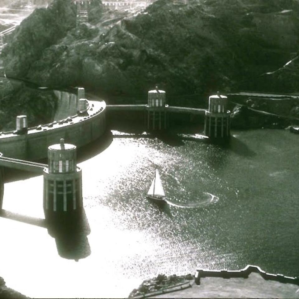 Glenn Davis photographed a sailboat on Lake Mead near the crest of Boulder Dam from the upstream Nevada side. The dam was officially renamed Hoover Dam in 1947.  (PH: 0020-0126)