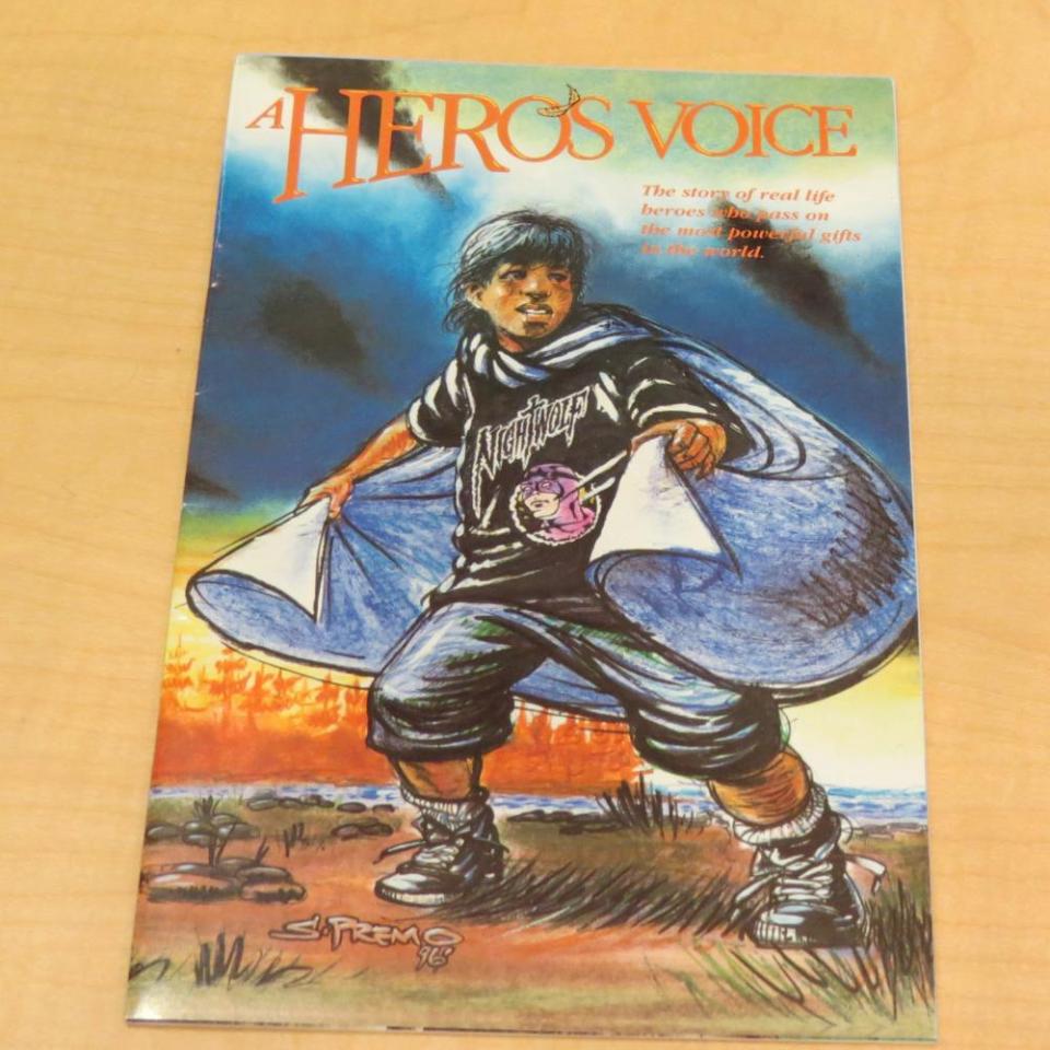A young boy posed in a wide stance gazes into the distance. His arms hold a cape outstretched at his sides. The young boy’s name is Georgie and he is an Ojibwe of the Mille Lacs Band in Minnesota. Georgie is one of the many characters depicted in comic books produced by the Mille Lacs Band to educate their children, and also the non-Native American public, on Ojibwe culture.