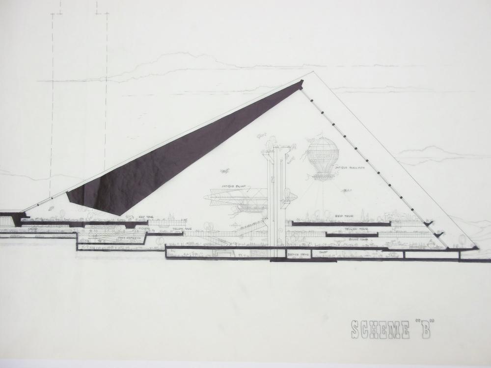 Stern’s proposal for the Autoworld complex features the typical resort amenities like hotel accommodations, casino gaming, restaurants, and outdoor sports recreation, as well as unique features like a working train, a miniature raceway, horseback riding, and a lagoon for boating. These drawings include Stern’s presentation drawings of different schemes for the architectural form of the main display atrium. These forms by Stern include a Xanadu-like pyramid in his first scheme and a futuristic Googie-styled second scheme (Scheme B) which recalls the Starship Enterprise from the Star Trek franchise. These drawings show large hot air balloon championing Harrah’s name high above the resort, while possibly allowing people to overlook the complex and all of its bustling splendor.